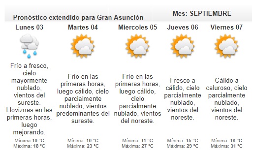 Según el reporte del meteorólogo de turno, Julio Ayala, las precipitaciones persistirán en gran parte del territorio nacional. Por otro lado, se espera que las condiciones climáticas mejoren a partir del lunes. La mínima será de 10 grados.