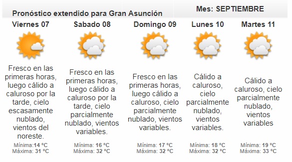 Para este jueves se estima una mínima de 13 grados y una máxima de 29. El cielo permanecerá despejado y los vientos soplarán del sector noreste.