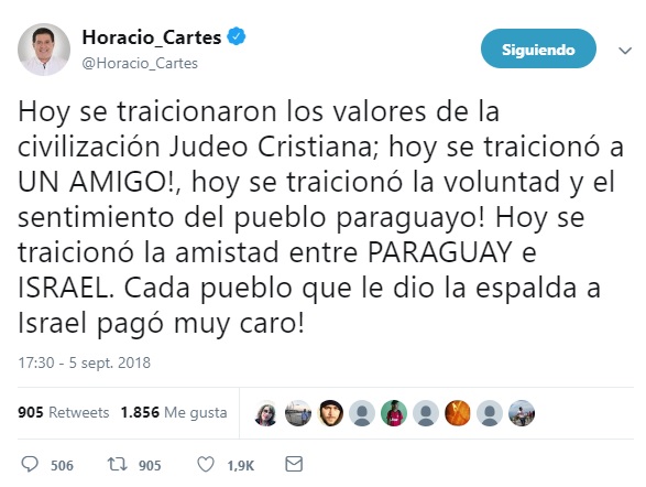 “Hoy se traicionaron los valores de la civilización Judeo Cristiana; hoy se traicionó a UN AMIGO!, hoy se traicionó la voluntad y el sentimiento del pueblo paraguayo! Hoy se traicionó la amistad entre PARAGUAY e ISRAEL. Cada pueblo que le dio la espalda a Israel pagó muy caro!” (sic), soltó el exmandatario a través de su cuenta en Twitter en la noche del miércoles.