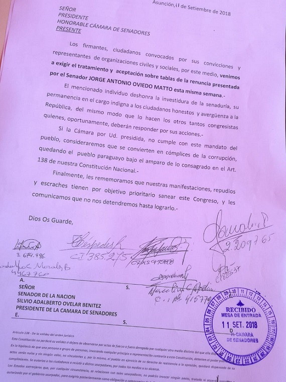 Este martes presentaron al titular de la Cámara de Senadores, Silvio Ovelar, mediante un documento, el pedido de tratamiento y aceptación sobre tablas de la renuncia del senador Jorge Oviedo Matto.