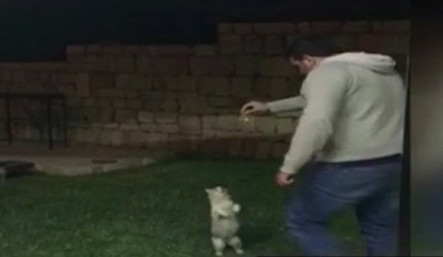 En las imágenes difundidas por el canal Telefuturo se puede ver a un hombre engañando a un gato. Cuando el felino se para en dos patas, el hombre le propina una fuerte patada.