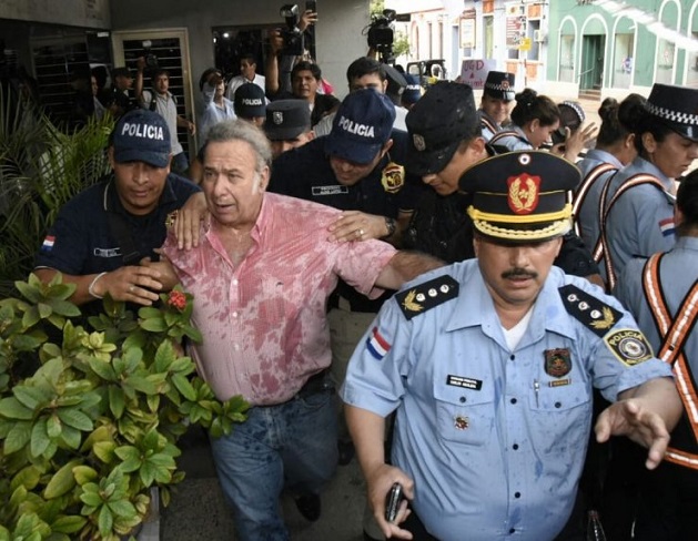 Al retirarse, manifestantes gritaron improperios al exlegislador y hasta le derramaron agua. Totalmente empapado y entre empujones, el político luqueño pudo abordar la patrullera que llevó hasta el Palacio de Justicia.