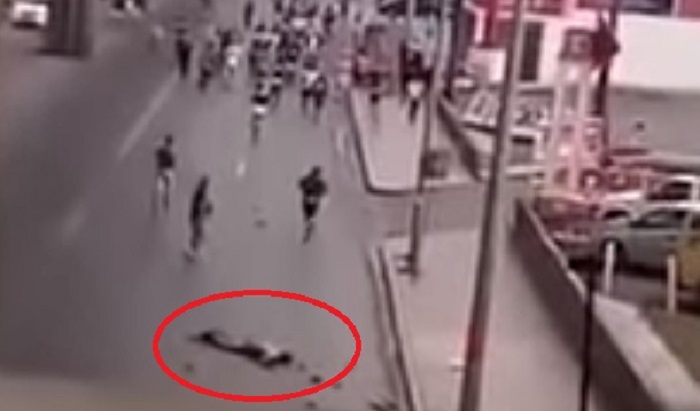 El joven quedó tendido en el pavimento, desnudo y sangrando. Fue trasladado a un hospital de la localidad.