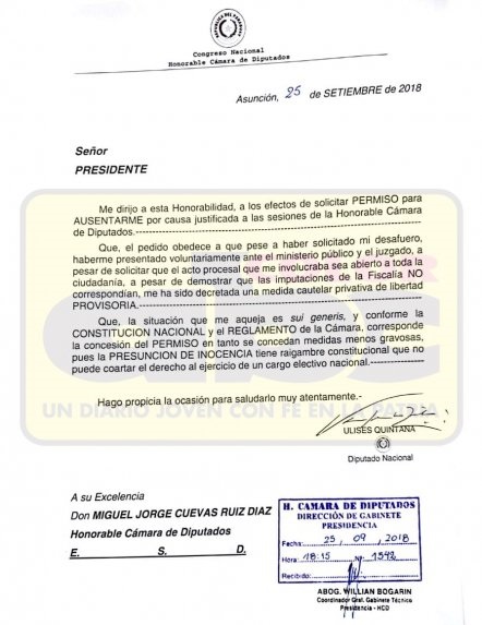 El legislador envió una nota al titular de la Cámara de Alta, Miguel Cuevas, en la que pide permiso para ausentarse de manera justificada de las sesiones de la Cámara por encontrarse recluido en el penal militar de Viñas Cué.