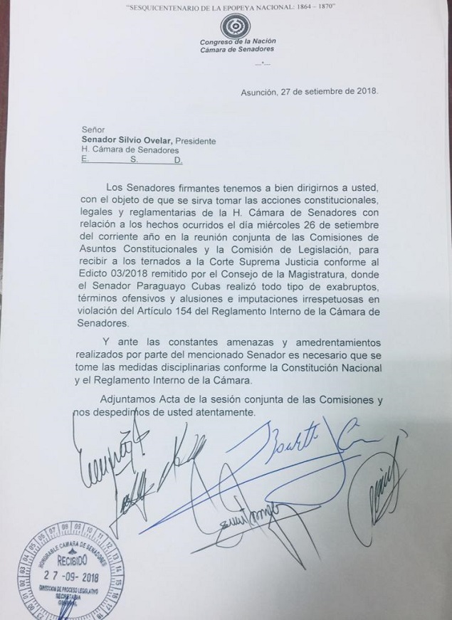 La propuesta se funda en los incidentes que se dieron el miércoles durante la sesión de Comisiones en la Cámara Alta. En el altercado, Cubas trató de delincuentes a sus colegas Javier Zacarías Irún y Enrique Bacchetta.