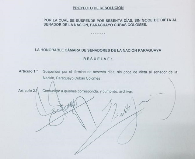 El proyecto en su artículo 1, señala lo siguiente: “Suspender por el término de sesenta días, sin goce de dieta al senador de la Nación, Paraguayo Cubas Colomes”.