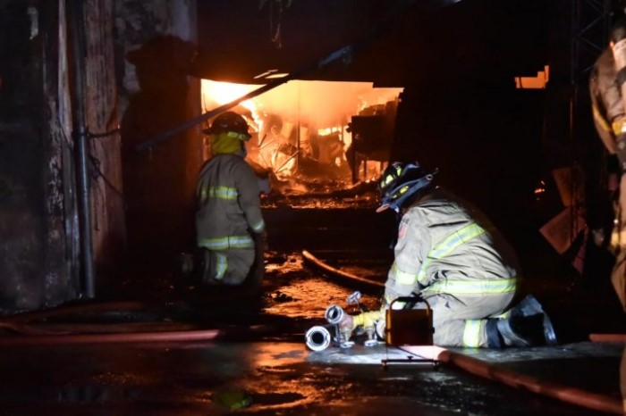 Unos 30 a 40 bomberos voluntarios se encuentran trabajando intensamente para extinguir el fuego que consumió por completo todas las pertenencias que había en interior de los comercios.