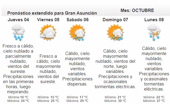 Según la meteoróloga de turno, Cinthia Espínola, las precipitaciones se registrarían durante todo el día, mientras que para la tarde se espera un leve aumento de la temperatura.