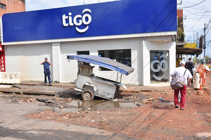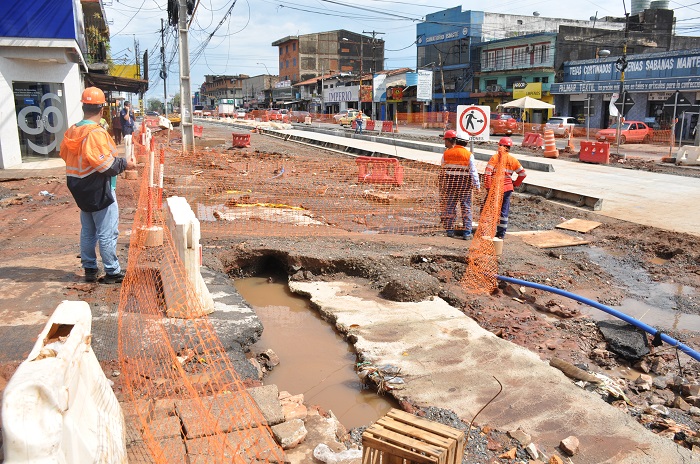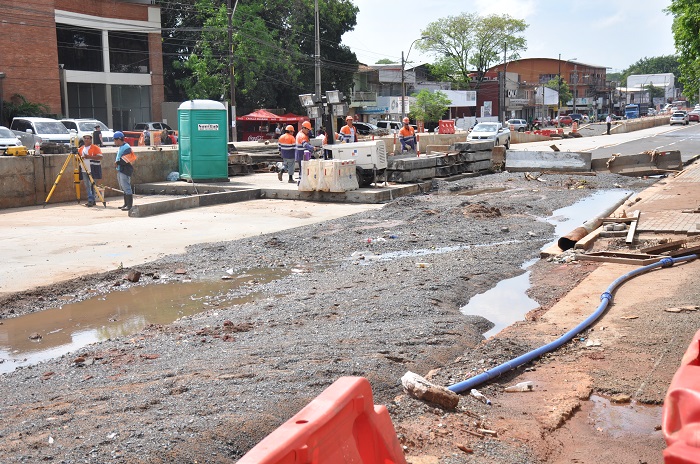 La zona de obras del metrobús, específicamente en la intersección de Mcal Estigarribia y Zavala Cué, ya no se encuentra inundada y obreros de la empresa contratista Mota Engil SA construyeron un improvisado paso peatonal con madera terciada para facilitar el cruce de las personas en el lugar.