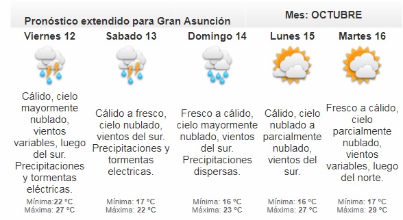 Para este jueves se estima una mínima de 20 grados y una máxima de 28 grados. El cielo se presentará mayormente nublado y los vientos soplarán del sector sureste.