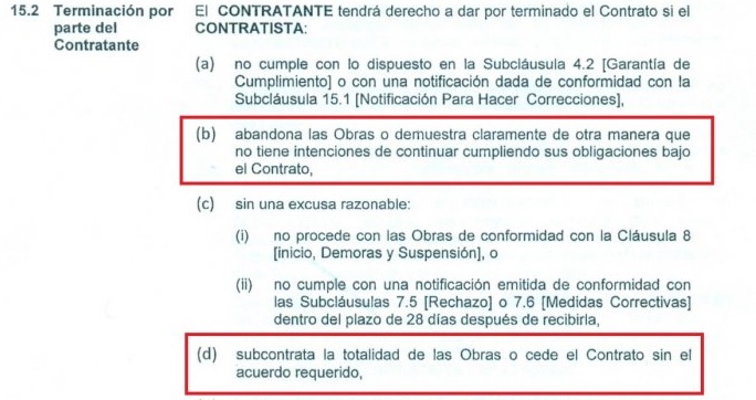 Se cita la cláusula 15.2, donde el Gobierno tiene dos elementos a su favor para cancelar las relaciones con Mota, el primer elemento es que una de las cláusulas establece que el contratante puede rescindir el contrato si la contratista abandona la zona de obras y el segundo ítem es que también se puede rescindir si la empresa subcontrata la totalidad de las obras.
