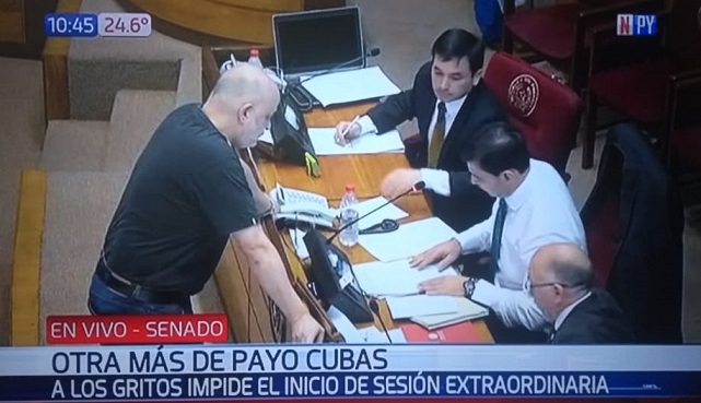 El senador Paraguayo Cubas montó en cólera cuando se levantó la sesión ordinaria del Senado por falta de quórum. Acusó a periodistas de recibir dinero del cartismo y pidió al presidente del Senado, Silvio Ovelar, que multe con G. 10 millones a los legisladores que ausentaron.