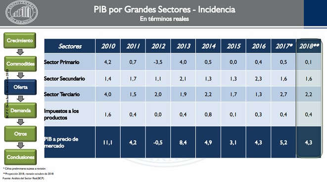 Con relación a la disminución en la previsión, la banca matriz señala que se debe a las inclemencias climáticas que han afectado la generación de energía eléctrica, también a las ofertas en el sector ganadero y al menor dinamismo de las obras públicas, sumándose además la situación económica de Brasil y Argentina.
