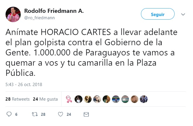 “Anímate HORACIO CARTES a llevar adelante el plan golpista contra el Gobierno de la Gente. 1.000.000 de Paraguayos te vamos a quemar a vos y tu camarilla en la Plaza Pública” (sic), fue lo que manifestó el legislador a través de su cuenta en Twitter.