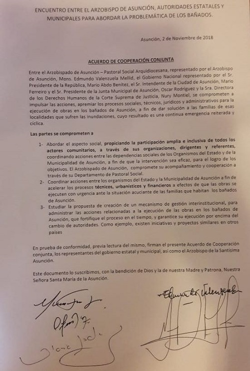 Firmamos un acuerdo de cooperación con autoridades de diferentes sectores para dar una solución definitiva a la problemática de las inundaciones en los bañados de Asunción, en donde vive el 15% de la población asuncena.