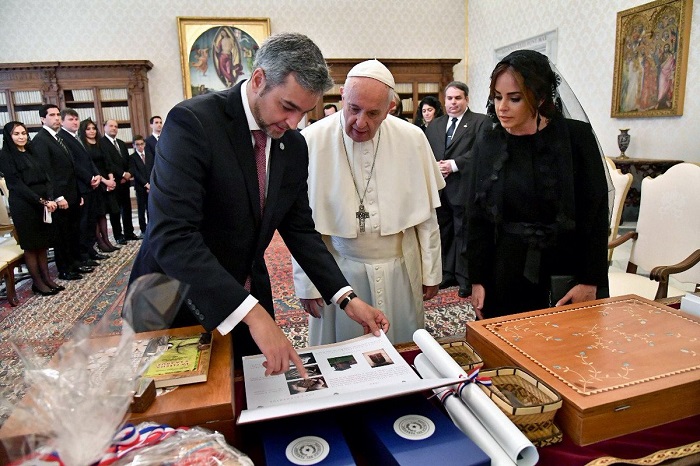 El mandatario paraguayo entregó varios obsequios como un trono papal, una bandeja con chipa, y el libro “La flecha y la cruz” de Efraín Enriquéz Gamón.