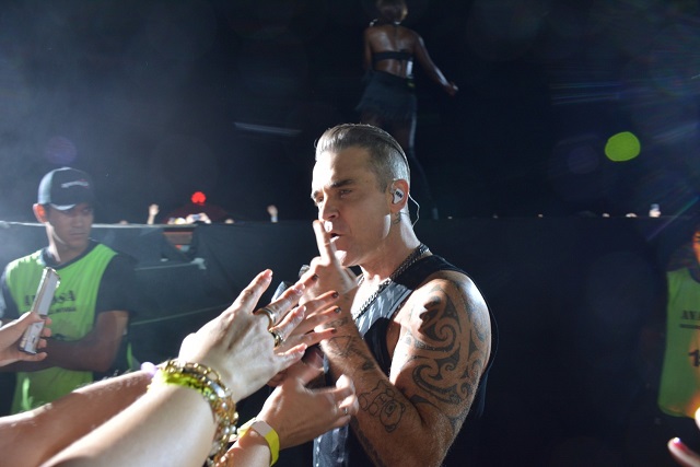 Poco después de las 23:00, Robbie pisó el escenario, ataviado con un atuendo que llamó la atención, cubierto con una musculosa negra y una pollera del mismo tono.
