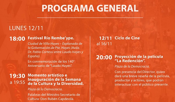 La apertura se dará con las palabras del ministro de la Secretaría Nacional de Cultura, Rubén Capdevila; seguidamente habrá un momento artístico y para las 20:00 se prevé la proyección de la película “La Redención”, con presencia del director, quien dará la reseña del audiovisual.