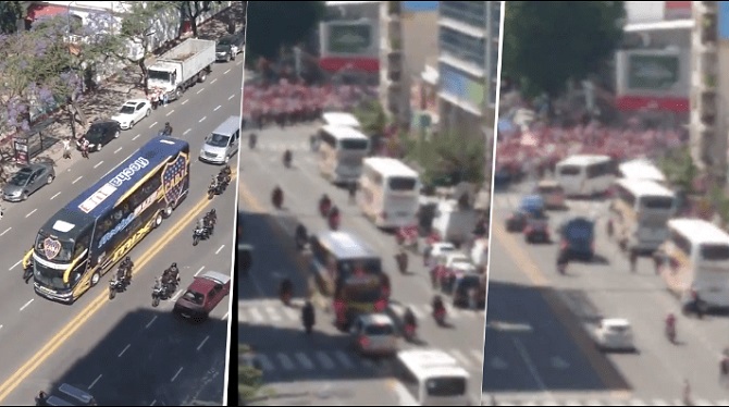 Video exclusivo de Promiedos con la llegada de Boca por Libertador, el micro entra por Monroe donde estaba lleno de hinchas de River pic.twitter.com/movRjyknFY