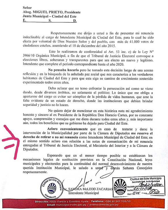 Aclaro convenientemente que en caso de tratarse y darse la intervención de la Municipalidad por parte de la Cámara de Diputados me reservo el derecho de retirar o no mi renuncia como Intendente Municipal de Ciudad del Este; en el mismo sentido aclaro con relación a las notas de comunicación de mi renuncia entregadas al Tribunal de Justicia Electoral, al Ministerio del Interior y a la Cámara de Diputados.