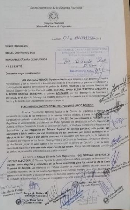 El libelo fue presentado con 14 firmas entre las que figuran las de algunos legisladores del PLRA, de Encuentro Nacional, Patria Querida y de Hagamos.