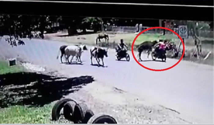 Motociclistas y automovilistas deben realizar maniobras peligrosas para evitar chocar contra los animales, o bien evitar ser atacados, ya que como se puede ver en el video la mujer fue pateada bruscamente por la res y cayó a un lado del camino.
