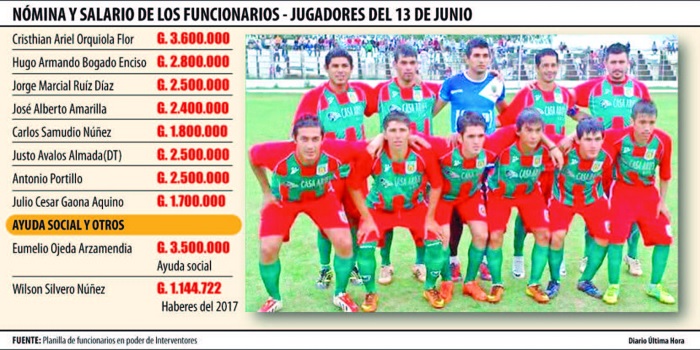 Según informó Última Hora, un total de seis jugadores y su director técnico forman parte de la nómina de funcionarios de la Municipalidad de Ciudad del Este. Los mismos forman parte del club 13 de Junio, del kilómetro 10 de dicha localidad, perteneciente a la exconcejala zacariista, Aida Molinas.