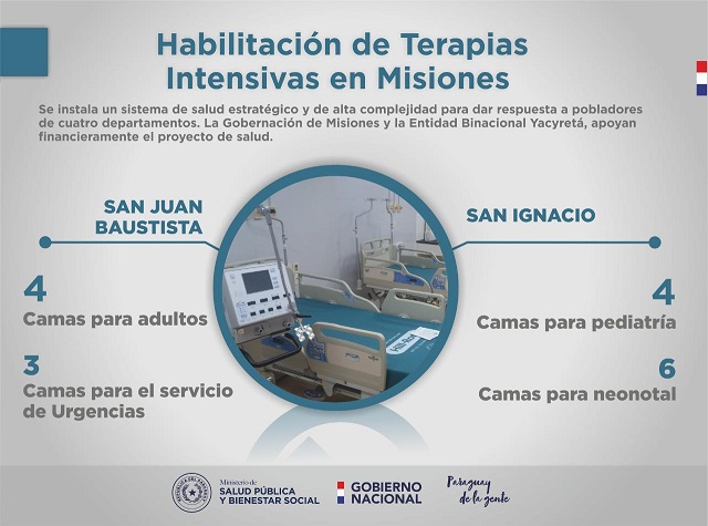 El mandatario inauguró dos modernas salas de terapia intensiva para niños y adultos, en los hospitales distritales de San Juan Bautista y San Ignacio, Misiones, con inversión total de 5.580.835.200 de guaraníes por parte de la Entidad Binacional Yacyretá (EBY).