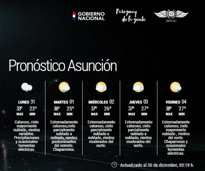 La temperatura para este domingo oscilará entre los 36°C y 25°C, el ambiente se presentará extremadamente caluroso con cielo parcialmente nublado.