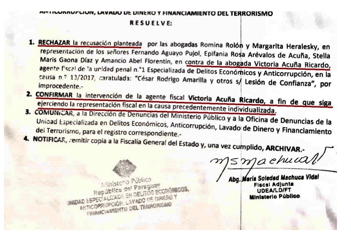 «La penosa resolución de la fiscal adjunta Soledad Machuca, que pretende ‘blanquear’ a Victoria Acuña, ya fue impugnada ante la Corte Suprema De Justicia, quien hará justicia y rectificará las intenciones equivocadas de algunos integrantes del Ministerio Público”.