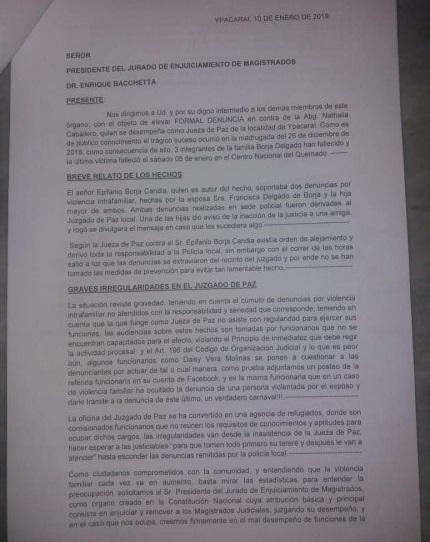El padre de la denunciante, Epifanio Borja Candia de 59 años, incendió la casa de la familia, en el siniestro murieron, Francisca Delgado de Borja 50, Sara Claribel Borja Delgado 14 y Fátima María Borja Delgado 21. Así también el autor del hecho.