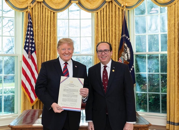 Luego de acto de acreditación del jefe de la misión diplomática de la República del Paraguay, el embajador mantuvo una conversación con el presidente Trump, ocasión en la que le transmitió el mensaje del presidente Mario Abdo Benítez sobre la predisposición de su gobierno de profundizar y fortalecer las relaciones existentes entre ambos países.