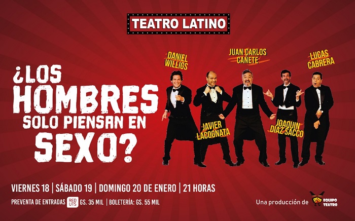 Desde este viernes 18 de enero hasta el domingo 20, el Teatro Latino acogerá la obra “¿Los hombres solo piensan en sexo?” con la actuación de Javier Lacognata, Lucas Cabrera, Joaquín Díaz Sacco, Daniel Willigs y Juan Carlos Cañete.