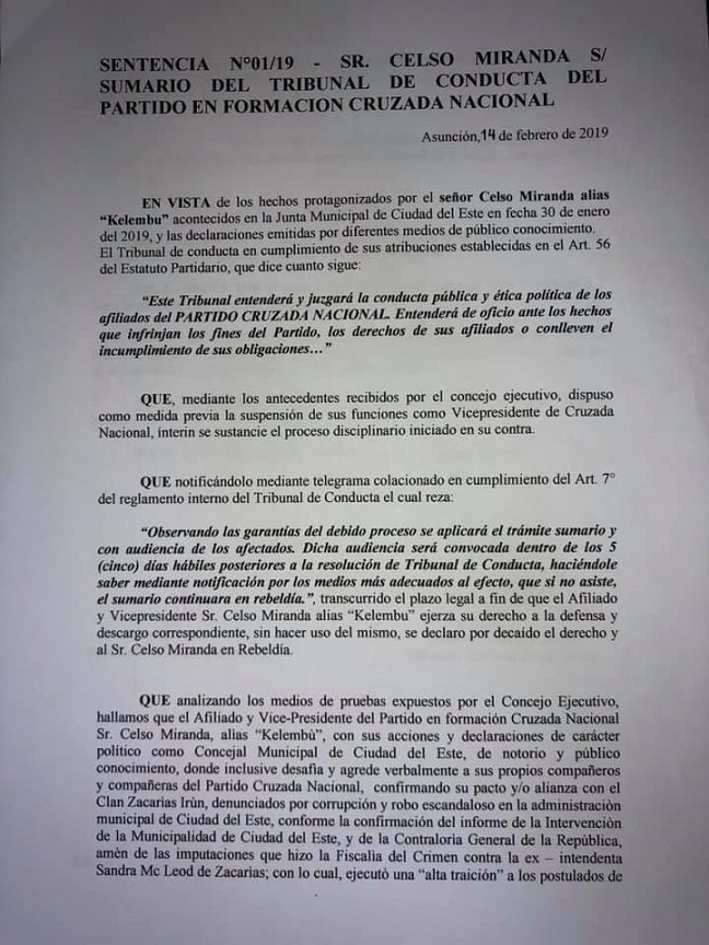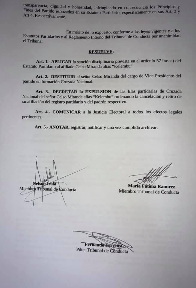 En una parte de la resolución se dispone «decretar la expulsión de las filas partidarias de Cruzada Nacional del señor Celso Miranda, alias ‘Kelembú’, ordenando la cancelación y retiro de su afiliación del registro partidario y del padrón respectivo».