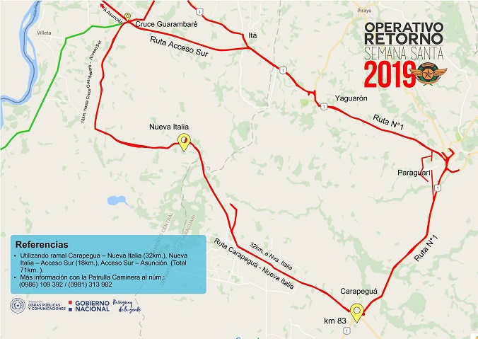 En el caso de los desvíos en el “operativo retorno”, el ramal Carapeguá a Nueva Italia será el utilizado en la ruta 1.