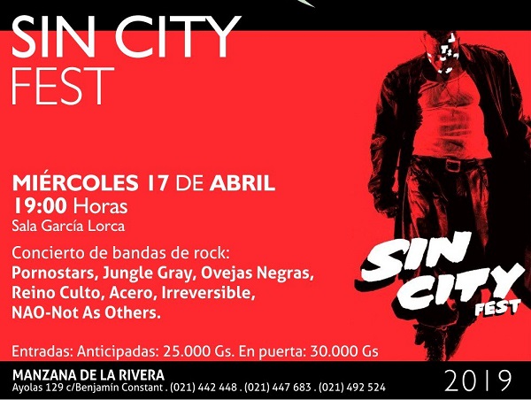 Este miércoles, a las 19:00 en la Sala Garcia Lorca de la Manzana de la Rivera, se realizará un conci9eto de bandas de rock, y estarán presentes, Jungle Gray, Ovejas Negras, Reino Culto, Acero, Irreversible, NAO-Not Others. El costo de las entradas anticipadas será de G. 25.000 y en puerta G. 30.000.
