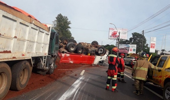 Bomberos se encuentran en el lugar recogiendo la arena esparcida y se espera que con una grúa del Ministerio de Obras Públicas, se saque el camión del sitio, informó Noticias Paraguay.
