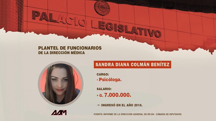 Sandra Diana Colmán Benítez es psicóloga y tiene un salario de G. 7 millones. Su ingreso se registró en 2018.