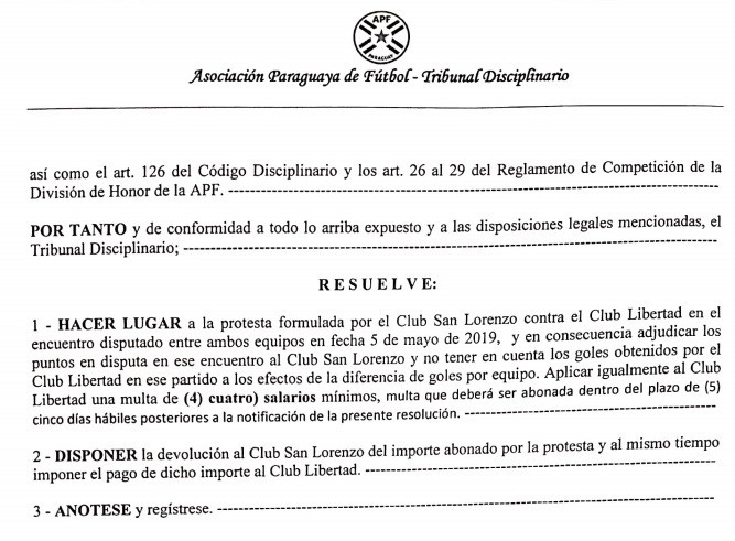El Tribunal Disciplinario de la Asociación Paraguaya de Fútbol (APF), en sesión de este viernes, resolvió adjudicar tres puntos al Rayadito. Tras la protesta del Sportivo San Lorenzo que cayó por 3 a 4 ante Libertad en la fecha 20 del Apertura.