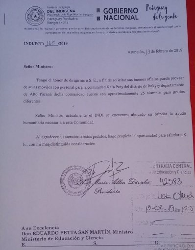 De acuerdo a los datos, el Instituto Paraguayo del Indígena (INDI) solicitó, mediante una nota emitida en abril, al Ministerio de Educación, un aula móvil para los niños.