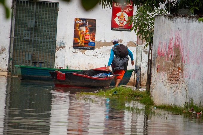 Un hombre arrastra una canoa, principal herramienta para movilizarse en el sitio inundado.