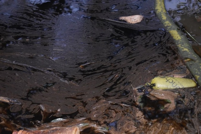 Los afectados colocaron ramas de árboles para evitar que el combustible siga corriendo por las aguas, sin embargo no es suficiente ya que el carburante quede estancado.