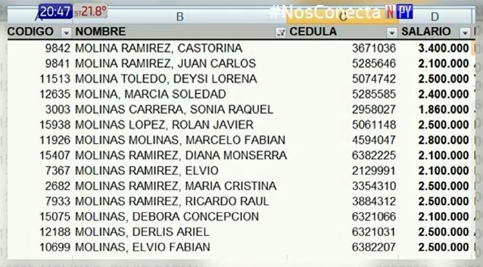 De acuerdo a los registros de la Municipalidad son 14 los parientes de Molinas dentro del ente. Entre hijos, hermanos y sobrinos, entre otros (los detalles en la imagen de arriba).