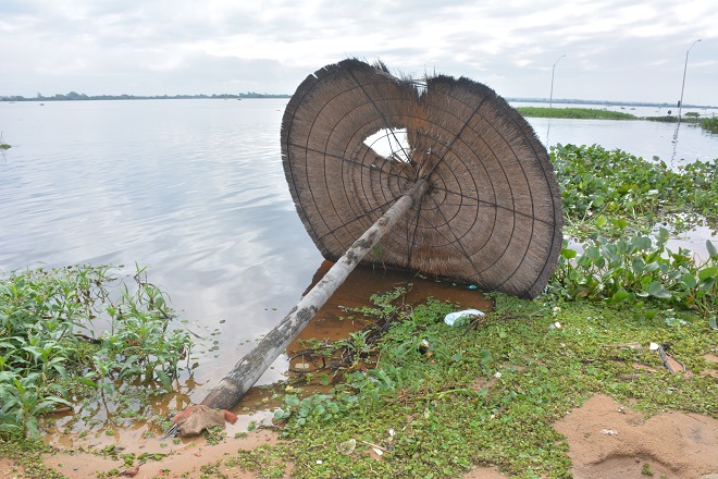 Una sombrilla de paja que normalmente da sombra a los visitantes de la costanera, yace en el agua.