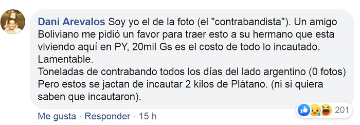 Por otro lado, la persona que lo transportaba, identificado como Dani Arevalos, en Facebook, comentó a través de su cuenta, que un amigo boliviano le pidió como un favor traer los productos a su hermano que está viviendo en Paraguay.