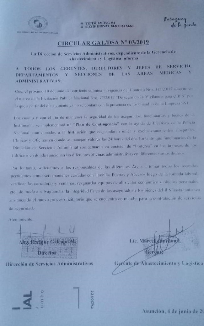 Mientras que 28 de mayo, el titular de la previsional, Armando Rodríguez, ordenó suspender la licitación para servicios de seguridad por G. 140 mil millones, luego del escándalo por supuesto intento de soborno a un periodista de Abc.