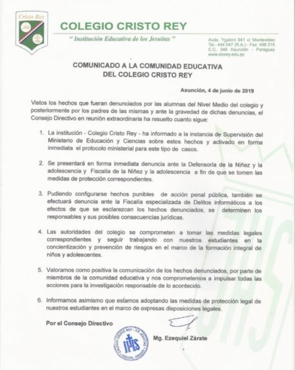 Luego de la polémica, el consejo directivo del Colegio Cristo Rey emitió un comunicado en el se compromete a tomar las medidas legales correspondientes, y a trabajar con los estudiantes en la concientización y prevención de este y otro tipo de riesgos.