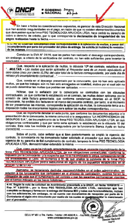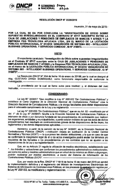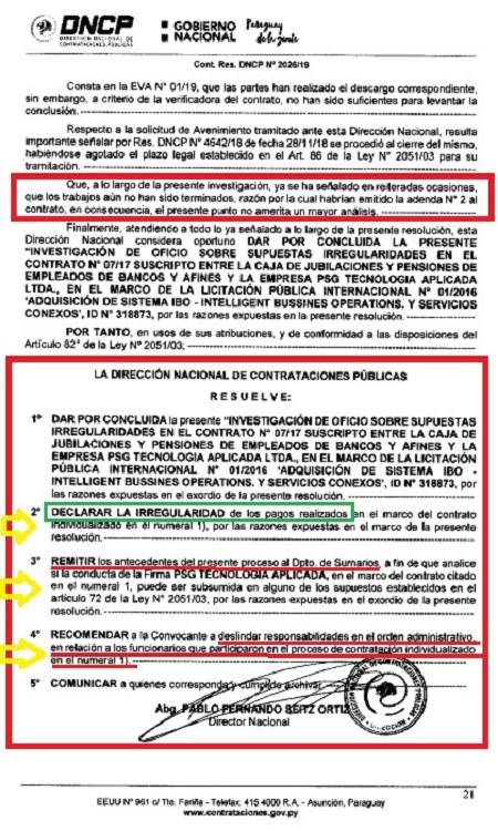 A la fecha del 31 de mayo de este año, la DNCP, emitió la Resolución Nº 2026/2019 que dispone: “Dar por concluida la Investigación de Oficio, ‘Declarar la irregularidad de los pagos realizados en el marco del contrato’”.