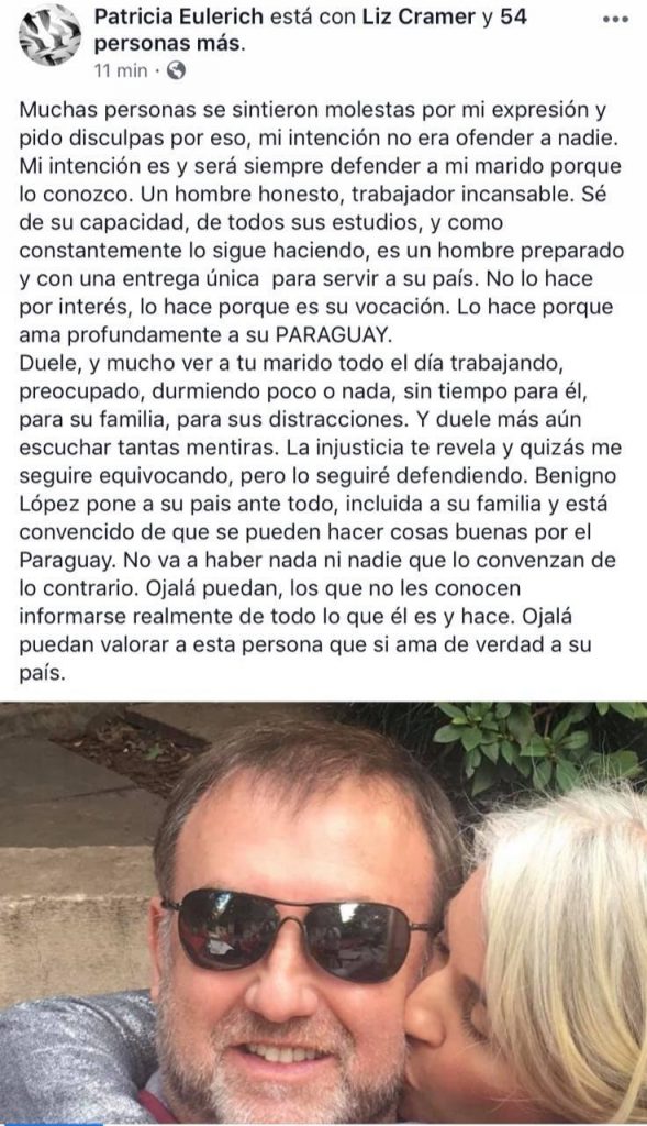 “Muchas personas se sintieron molestas por mi expresión y pido disculpas por eso, mi intención no era ofender a nadie. Mi intención es y será siempre defender a mi marido porque lo conozco. Un hombre honesto, trabajador incansable”, fue lo que redactó ya en la noche del domingo.