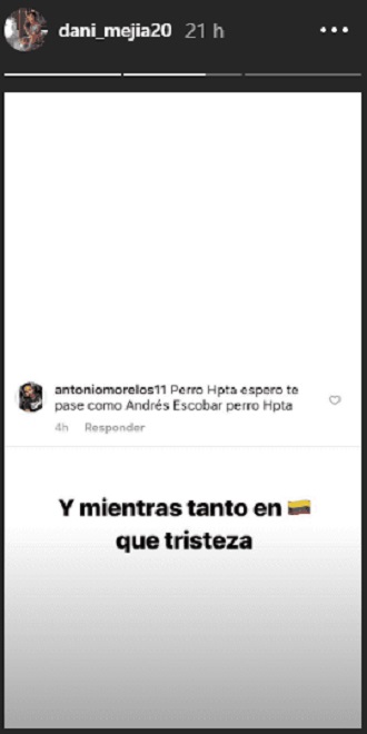 «Y mientras tanto (bandera de Colombia) que tristeza» y señaló: «Dios les de paz, acá me quedaría toda la mañana publicando las amenazas hacia mi esposo y hacia nosotros. Una lástima», reza una parte de la nota de Mejía.